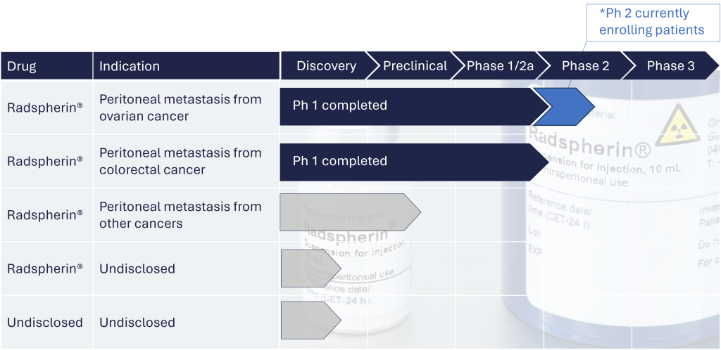 The company’s lead candidate Radspherin is currently in clinical development in two indications; peritoneal metastasis from ovarian and colorectal cancer but is also relevant for treating peritoneal metastasis from other cancer types and potentially metastatic cancer in other body cavities.